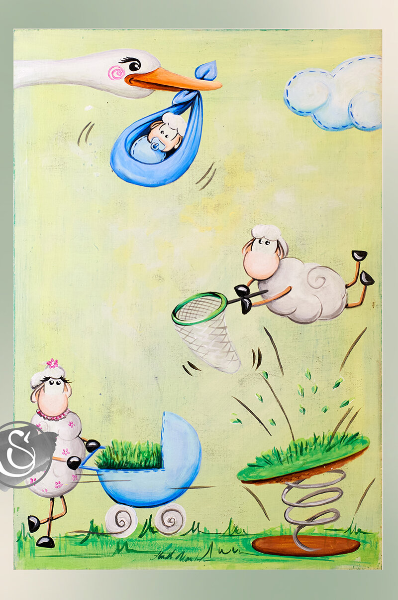 Quadro "Ti prendo! _ Azzurro" della collezione "Le Pecore" dipinto a mano su legno 20x30 cm.