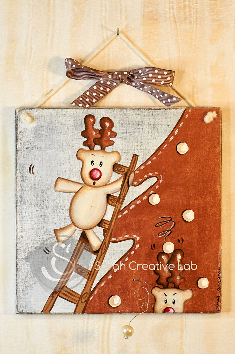 Quadro "Cadono Palline" della collezione "Le Renne" dipinto a mano su legno 20x20 cm.